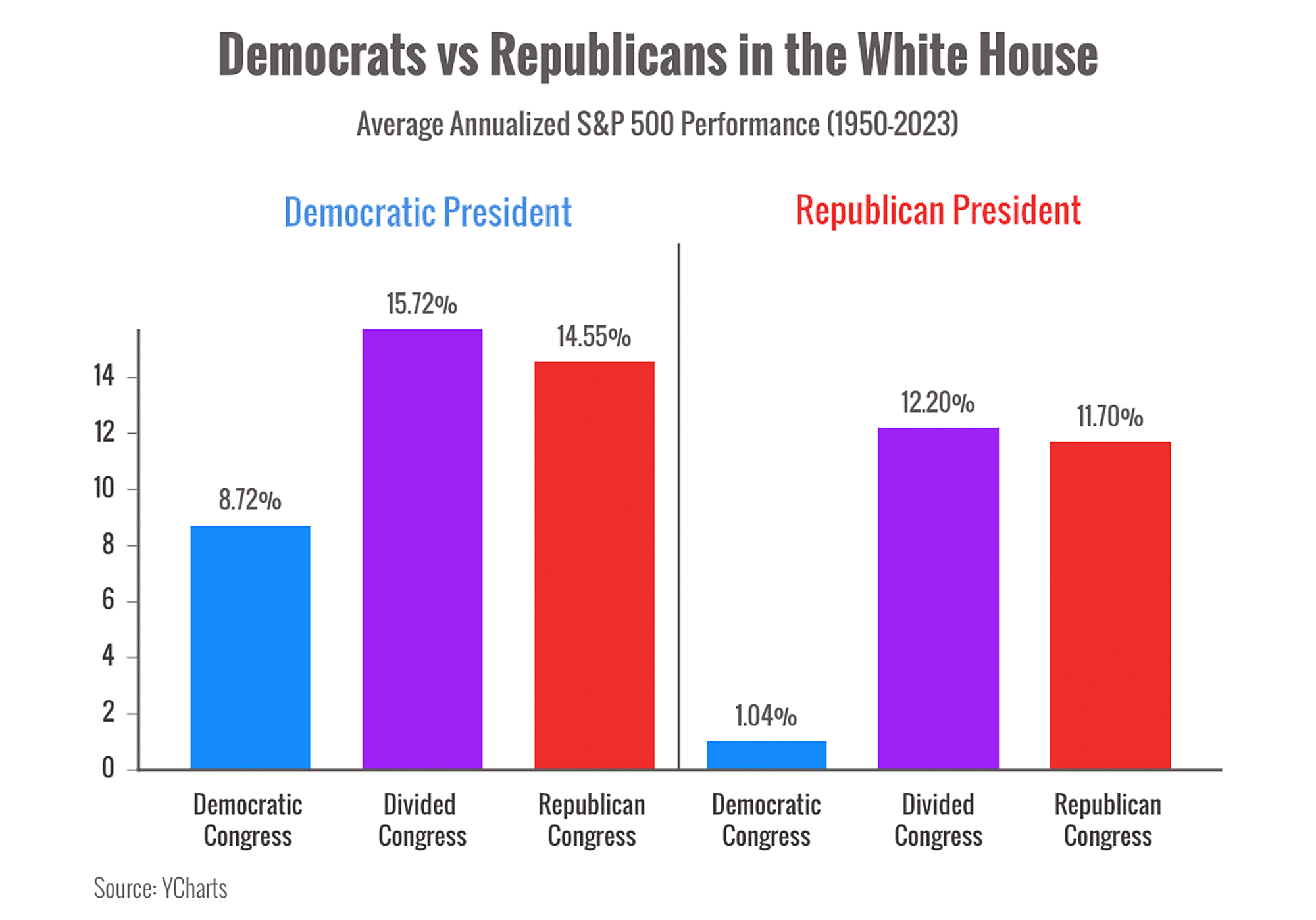 The chart gives a quick look at how the S&P 500 performed when each party held the White House.